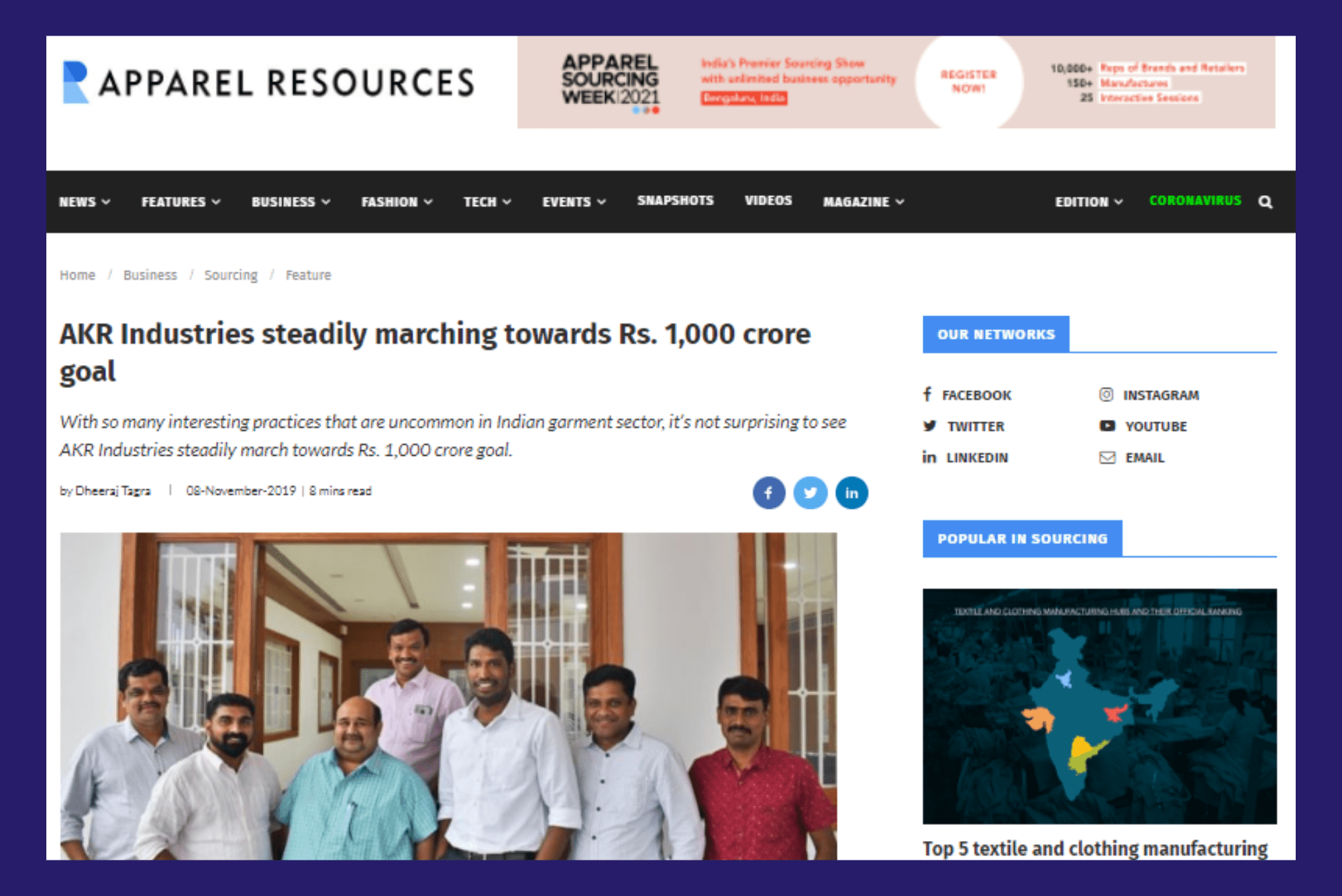 Article Although it’s new to the United States, Tirupur, India-based AKR Textiles is no stranger to the apparel and textile industry. The family-owned business got its start